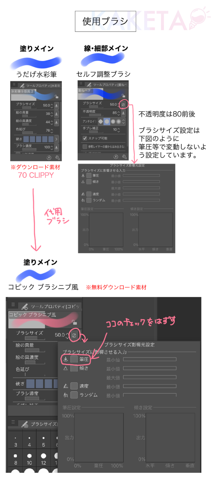 同じブラシでなくとも、似た設定のブラシカスタムをすれば応用も可能かと思います!